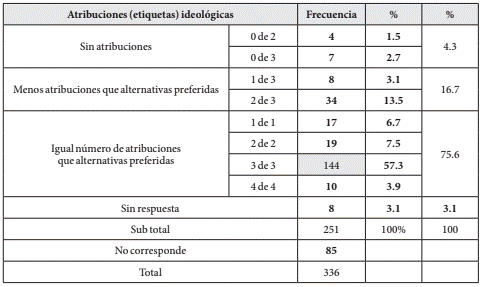 Para establecer la amplitud y diversidad del consumo informativo con base en los etiquetamientos ideológicos, el análisis retoma aquí la primera mención de fuentes/medios preferidos para el acceso a la información política, es decir aquella alternativa priorizada cotidianamente desde la perspectiva de quien responde (Tabla 4). Considerando esta mención, se observó que la mayoría (75,6%) pudo etiquetar cada uno de los programas, canales, frecuencias o interlocutores identificados. La moda correspondió así a la categoría “3 de 3” (144 casos).