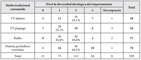 Un análisis más desagregado permite establecer que, en el caso de los medios tradicionales (N = 229) considerados en la primera mención, la mayoría (91,6%) realiza al menos un etiquetamiento ideológico, resultando también mayoritaria la correspondencia entre cantidad de fuentes específicas identificadas y cantidad de etiquetamientos ideológicos (73,3%). Por otra parte, 18,3% etiqueta a menos programas, canales/frecuencias o medios gráficos que los que logró identificar. Al valorar la diversidad de los etiquetamientos ideológicos de estos medios tradicionales, se destaca que 36,4% registra una dieta conformada por tres alternativas etiquetadas recurriendo a dos etiquetas ideológicas. A su vez, 59,8% registra diversidad ideológica etiquetando ideológicamente a sus fuentes con dos o tres posiciones ideológicas diferentes. El 24,4% consume más de una fuente/medio a las que etiqueta recurriendo a una única categoría y 7,4% registra “monoconsumo”. En función del tipo de medio tradicional priorizado cabe resaltar la presencia de mayor diversidad ideológica entre quienes consumen medios gráficos (diarios, periódicos o revistas). El 64,1% reporta el consumo de información política proveniente de fuentes etiquetadas con dos posiciones ideológicas (Tabla 5).