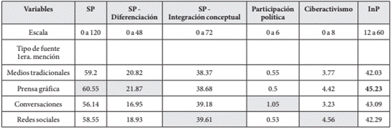 El análisis realizado en un segundo momento se orientó a establecer si había relación entre la dieta informativa con el InP, las subdimensiones de la SP (diferenciación e integración conceptual), la medición integral de la SP (suma de ambas subdimensiones), el ciberactivismo y el nivel de participación política. Como se observa en la Tabla 6, en términos descriptivos registramos valores similares en la SP en función del tipo de fuente priorizada (primera mención), siendo menor entre quienes mencionaron las conversaciones. Estos encuestados también contrastan en relación con el nivel de participación política, duplicando el valor respecto de los otros tipos de fuentes.