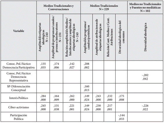 Por otra parte, se consideró al conjunto de medios tradicionales mencionados en primer orden de prioridad. El InP correlaciona positivamente con todas las variables relativas a las dimensiones del consumo. Siendo más acentuada esta relación con la amplitud de las etiquetas ideológicas (.243 Spearman, p=.01) (Tabla 7). La medida empleada para captar ciberactivismo evidenció correlación positiva con tres variables relativas a las dimensiones del consumo informativo. Adicionalmente resulta relevante señalar la correlación positiva entre la amplitud de “soportes” específicos (programas, canales, periódicos) y la SP - Diferenciación, incluyendo también una relación más específica con la subdimensión “Democracia participativa: conocimiento táctico e identificatorio”. Por último, el nivel de participación política evidenció una relación inversa con la diversidad ideológica. Estas relaciones permiten sostener que la medida motivacional, captada por la escala de InP y cuyos ítems actitudinales refieren mayoritariamente a procesos electorales y partidos, se complementa con las medidas objetivas relativas al consumo informativo, las cuales indican el interés de una persona en temas políticos. Al considerar ambas redes sociales junto a las fuentes no mediáticas (conversaciones), es decir las fuentes no tradicionales, se observa en términos generales que el nivel tanto del Conocimiento Político más asociado a la democracia representativa (subdimensión SP -Diferenciación) como del ciberactivismo sería mayor cuanto menor sea la diversidad ideológica de las fuentes usadas para informarse sobre política.
