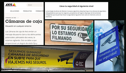 Las sociedades de control son “maquinarias de producción de miedos y de dispositivos para enfrentarlos” (Diego Galeano en Rodríguez, 2008, p. 3). Buena parte de las cámaras que aquí nos competen pueden -además de transmitir y almacenar imágenes en vivo- girar, inclinarse, acercarse, alejarse y son controlables y configurables en forma remota. En base a tales características, son tipificadas como tecnologías “de seguridad” o “de vigilancia” y comercializadas bajo dichos conceptos. Sus fabricantes -Axis, HikVision, Mobotix, Toshiba, entre otros- las proponen como idóneas “para los requisitos de las redes de vigilancia y seguridad más exigentes”, “para reducir el crimen y el desorden”, “proteger todos los alrededores”, o “ayudar a mantener la paz”. Quienes las adquieren y utilizan ponen en acto dichas construcciones de sentido.