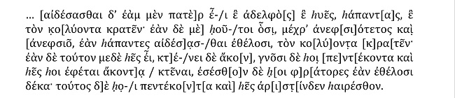 Se otorga perdón si hay un padre o hermanos o hijos, por parte de todos ellos, o tiene prioridad quien lo impide. Y si no hay éstos, se otorga perdón por parte de aquéllos hasta el grado del hijo del primo y el primo, si todos quieren perdonarlo; tiene prioridad quien lo impide. Y si ni siquiera hay alguno de éstos vivos, y el asesino actuó involuntariamente (ákon), y los Cincuenta y Uno, los ephétai, deciden que actuó involuntariamente (ákonta), que entonces los miembros de la fratría lo admitan en la ciudad, si diez (de ellos) quieren (eàn ethélosi). Que los Cincuenta y Uno elijan a estos hombres según su rango (aristínden).