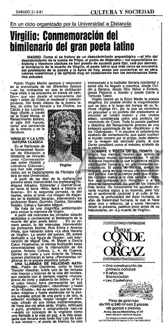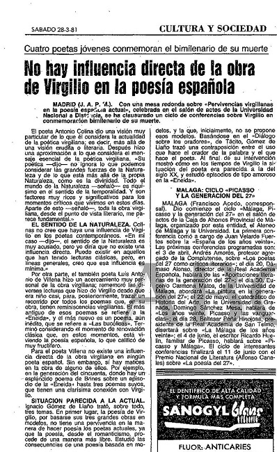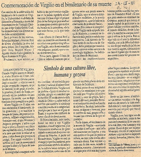 No es un hecho baladí para nuestro estudio que en 1981 se conmemorara el bimilenario de la muerte de Virgilio. Esta conmemoración tuvo un eco específico en Italia y, de manera notable, en la propia Ciudad del Vaticano, en cuya Biblioteca Apostólica se organizó una exposición virgiliana20 y donde hasta el mismo Papa Juan Pablo II pronunció un discurso sobre Virgilio en lengua latina.21 Si bien de manera más discreta, el bimilenario también tuvo su eco en España, con celebraciones y actos en recuerdo del poeta.22 De entre aquellos actos, por la transcendencia que tuvo para el ámbito de la propia creación poética, debemos destacar el congreso celebrado en la madrileña Universidad Nacional de Educación a Distancia (UNED), que tuvo su discreto eco en los diarios El Paísy ABC. Es interesante hacer una lectura de tales reseñas, comenzando por la de El País, que aparece en la siguiente página.23
