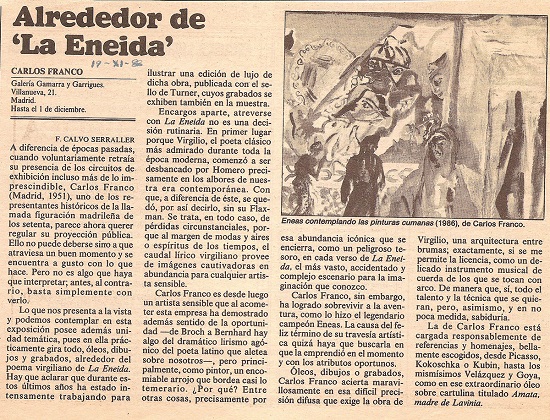 El catálogo de la exposición sobre La Eneida,80 por su parte, muestra una mayor libertad temática. Aunque Carlos Franco se sigue inspirando mayormente en el poema épico de Virgilio, ya no lo hace como mero ilustrador. Por ello, ahora se ayuda de pequeños títulos que contextualicen la obra gráfica. Sin embargo, las referencias textuales concretas siguen haciéndose evidentes. La gran diferencia estriba, sin duda, en que ahora el artista elige una serie de motivos y personajes de manera específica, como si estuviera desmontando el gran relato épico para construir nuevos microrrelatos a partir de la propia Eneida. En el diario El País (19 de noviembre de 1988) apareció una interesante reseña sobre la exposición a cargo de Francisco Calvo Serraller, que aparece en la siguiente página.81