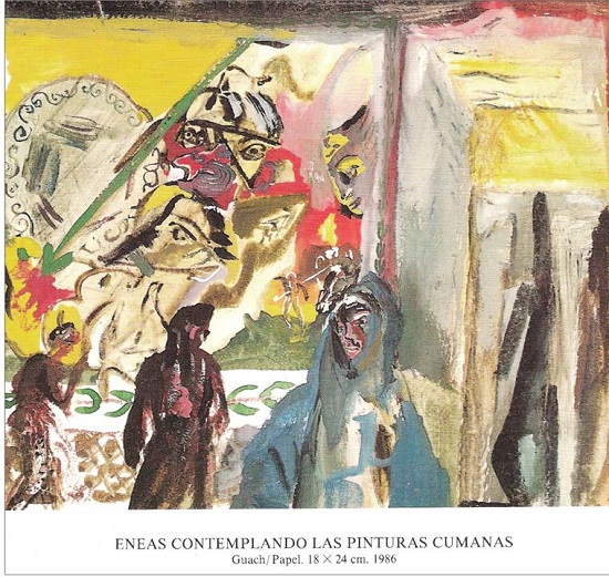Esta “luz maligna”, propia del infierno al que desciende Eneas con la Sibila, es comparada con la luz del cuadro de Ingres donde Augusto, ante la mirada despectiva de Livia, sostiene a Octavia, dado que ésta se ha desmayado al escuchar el nombre de su hijo Marcelo, evocado en un verso del libro VI de la Eneida que está recitando Virgilio, aunque no aparece en el cuadro. Más allá de las diferencias estéticas de este cuadro de Ingres con respecto a la obra de Carlos Franco, cabe destacar el hecho común de remitirse a los versos 882-886 del libro VI de la Eneida: tu Marcellus eris. Dentro del prólogo del catálogo, la Eneida es considerada de manera significativa como un cúmulo de sensaciones (sucesión, maraña, madeja, órgano). Si comparamos estas composiciones con las ilustraciones destinadas a la traducción de la Eneida, cabe señalar tanto los motivos comunes como los divergentes. Hay motivos recurrentes (alegría, irracionalidad, sexo, crueldad…), así como la “textualidad” de algunas imágenes, muy cercanas a ciertos versos de la obra. Este conjunto de composiciones sobre la obra literaria nos permite observar cómo, más allá de la mera ilustración, estamos ante una verdadera relectura visual donde, no obstante, cabe encontrar rasgos textuales concretos. Veamos el ejemplo significativo de la composición titulada “Eneas contemplando las pinturas cumanas”. Cabe preguntarse, en principio, si, al referirse a las “pinturas cumanas”, Carlos Franco está pensando las representaciones cinceladas por Dédalo en el templo de Cumas. Si estamos en lo cierto, la pintura de Carlos Franco se estaría refiriendo de manera muy concreta a unos versos del libro sexto de la Eneida, justamente el momento en que Acates ha regresado con la sacerdotisa Deífobe para avisar a Eneas, extasiado ante la obra de Dédalo, de que deben ponerse manos a la obra con los ritos pertinentes para poder ingresar en los infiernos. Se trata de un pequeño texto ecfrástico donde el poeta no sólo describe lo que aparece cincelado en la obra de Dédalo, sino lo que habría podido seguir cincelando sobre el oro (la caída de su hijo Ícaro), en caso de que el dolor no hubiera hecho al padre deponer sus manos: