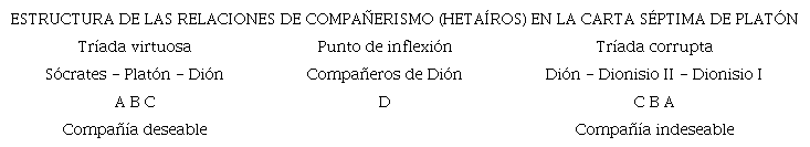 En conformidad con las ideas desarrolladas hasta ahora, el término hetaíros resulta crucial para definir las relaciones amistosas dentro de la Carta séptima. Un acercamiento al texto, sobre la base del uso de hetaíros, permite en realidad establecer dos triadas para dar cuenta de la estructura de la relación de compañerismo. De un lado, se ubica el vínculo Sócrates-Platón-Dión, del otro Dionisio I-Dionisio II-Dión. El punto central de ambas asociaciones lo constituye Dión, por lo cual, en realidad se tendría una especie de quiasmo donde el elemento central serían los amigos de Dión. La estructura final quedaría representada de la siguiente manera: