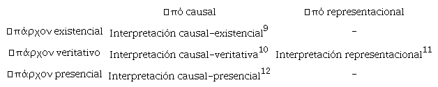 Los cuadros vacíos en esta tabla corresponden a interpretaciones que, aunque posibles, no han sido propuestas por nadie a la fecha. De este modo, podemos observar que el sentido representacional de ἀπό sólo se ha combinado con la acepción veritativa de ὑπάρχον en la que denomino interpretación representacional. Por el contrario, el sentido causal de ἀπό ha sido combinado con las tres acepciones de ὑπάρχον, de modo que tenemos tres tipos de lo que denomino interpretaciones causales. A lo largo de este artículo, utilizaré los nombres que les he asignado en el cuadro para referirme a estas cuatro interpretaciones.