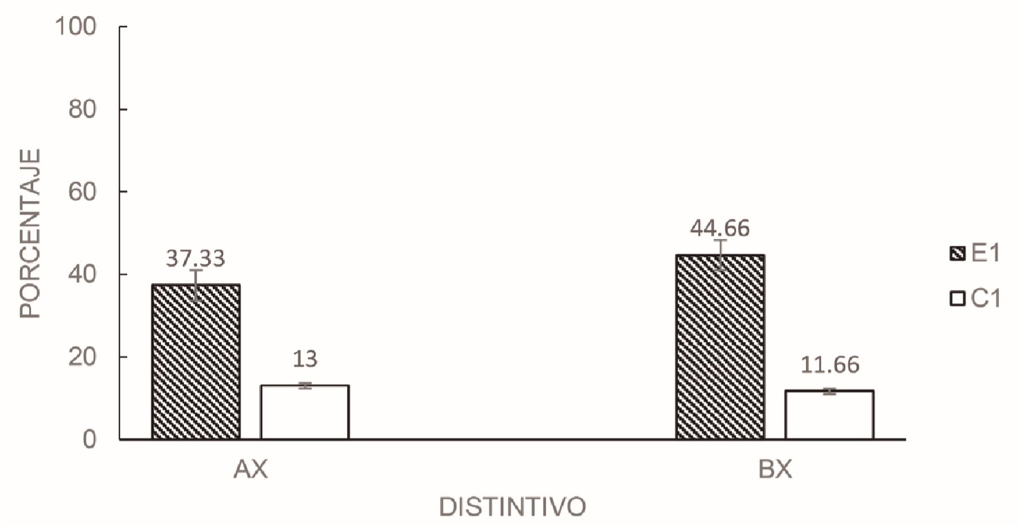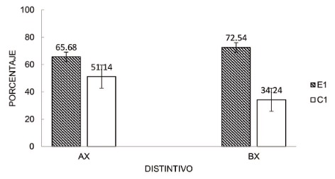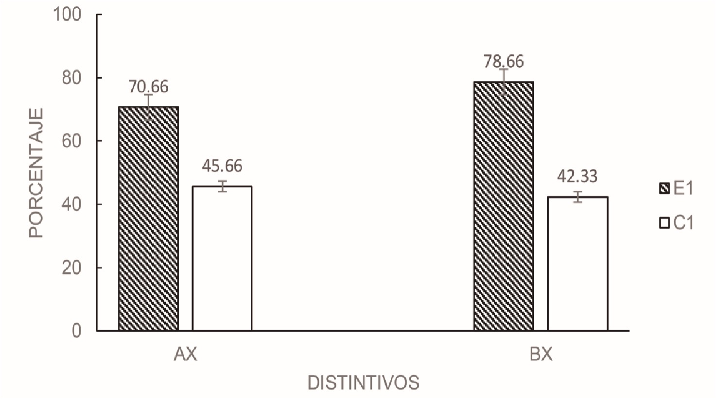 Nota Se puede observar la ejecución en porcentaje promedio de ensayos correctos para los grupos E1 (líneas diagonales) y C1 (en blanco) por distintivo (AX/BX). Las barras verticales indican el Error Típico.