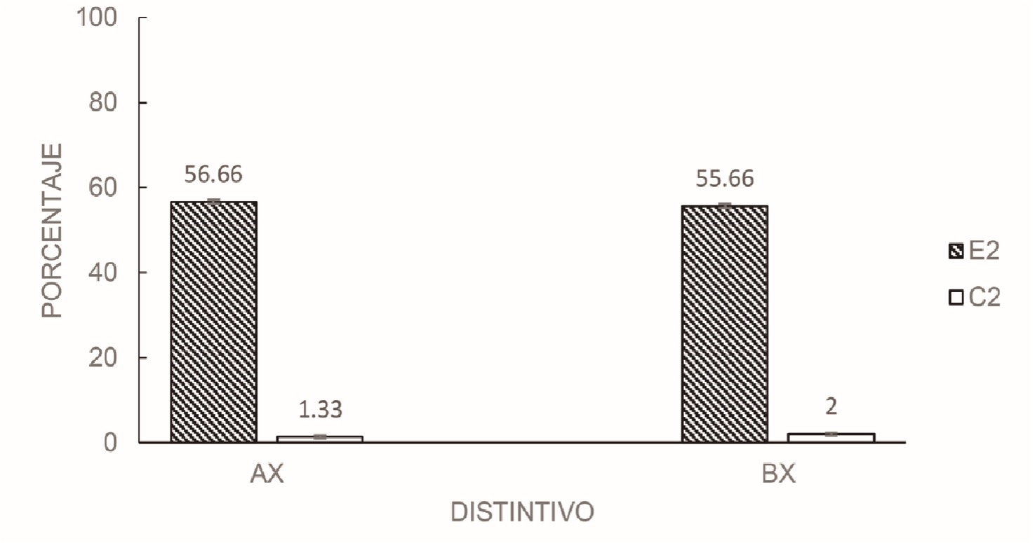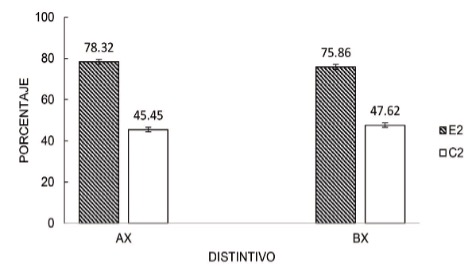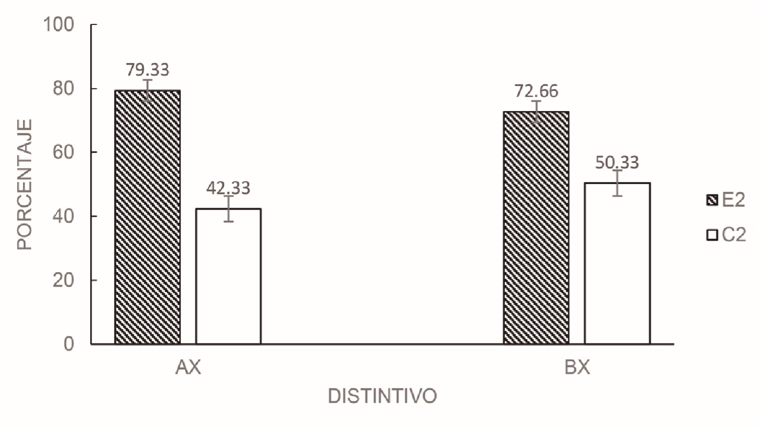 Nota. Se muestra el porcentaje promedio de ensayos correctos obtenido por el grupo E2 (líneas diagonales) y C2 (en blanco), para cada distintivo (AX y BX). Las barras verticales indican el Error Típico.