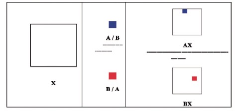Nota. La Letra X representa a la característica común (cuadro grande con fondo blanco); las letras A y B representan a las características únicas del compuesto (recuadro pequeño en color); el conjunto de letras: AX y BX representan a cada estímulo compuesto, el cual muestra la relación entre dos dimensiones (color y posición): cuadro azul-arriba / cuadro rojo-abajo o viceversa (cuadro rojo-arriba, cuadro azul-abajo).