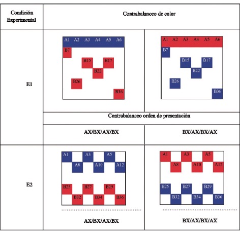 De esta manera, para la mitad de los participantes de cada grupo, A fue un cuadro azul en posición arriba del patrón X y B fue un cuadro rojo en posición abajo del patrón X; para la otra mitad de los participantes, la relación color-posición fue inversa (condición de contrabalanceo de color). De la misma forma que con el color, el orden de presentación de los estímulos se contrabalanceó, de forma que a la mitad de los sujetos de cada grupo se les presentó AX seguido de BX, de nuevo AX y BX y así sucesivamente hasta finalizar con los ensayos; para la otra mitad este orden se invirtió: BX/AX/BX/AX, etc. (ver Figura 2).