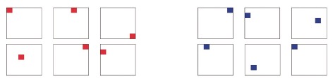 En la fase de prueba se mostraron simultáneamente seis estímulos compuestos (ver Figura 3) de los cuales tres mostraban una de las relaciones color-posición pre-expuestas (correctos). Los estímulos estuvieron contenidos en un panel de 3×2, con un tamaño de 1159×688 pixeles; cada elemento del panel tuvo el mismo tamaño que el estímulo individual observado en la fase de pre-exposición.