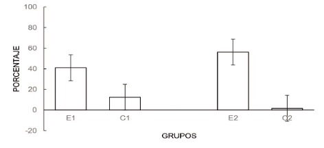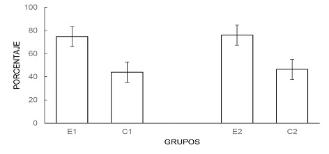Nota. Se pueden observar los porcentajes obtenidos por los grupos experimentales (E1 y E2) y los grupos control (C1 y C2) durante la fase de prueba del experimento 2. Las barras verticales muestran el Error Típico.