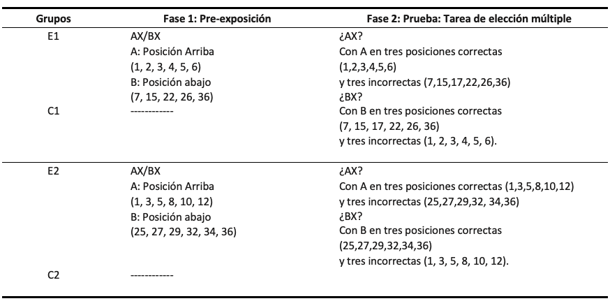 El experimento tuvo dos Grupos Experimentales (E1 y E2) y dos Grupos Control (C1 y C2). Hubo dos fases: Pre-exposición y Prueba. Sólo los grupos experimentales fueron pre-expuestos a los arreglos perceptivos (AX y BX), mientras que todos los grupos realizaron la prueba de elección múltiple en la que se preguntó por las relaciones color-posición arriba (¿AX?) y color-posición abajo (¿BX?). La Tabla 1 muestra el diseño empleado.