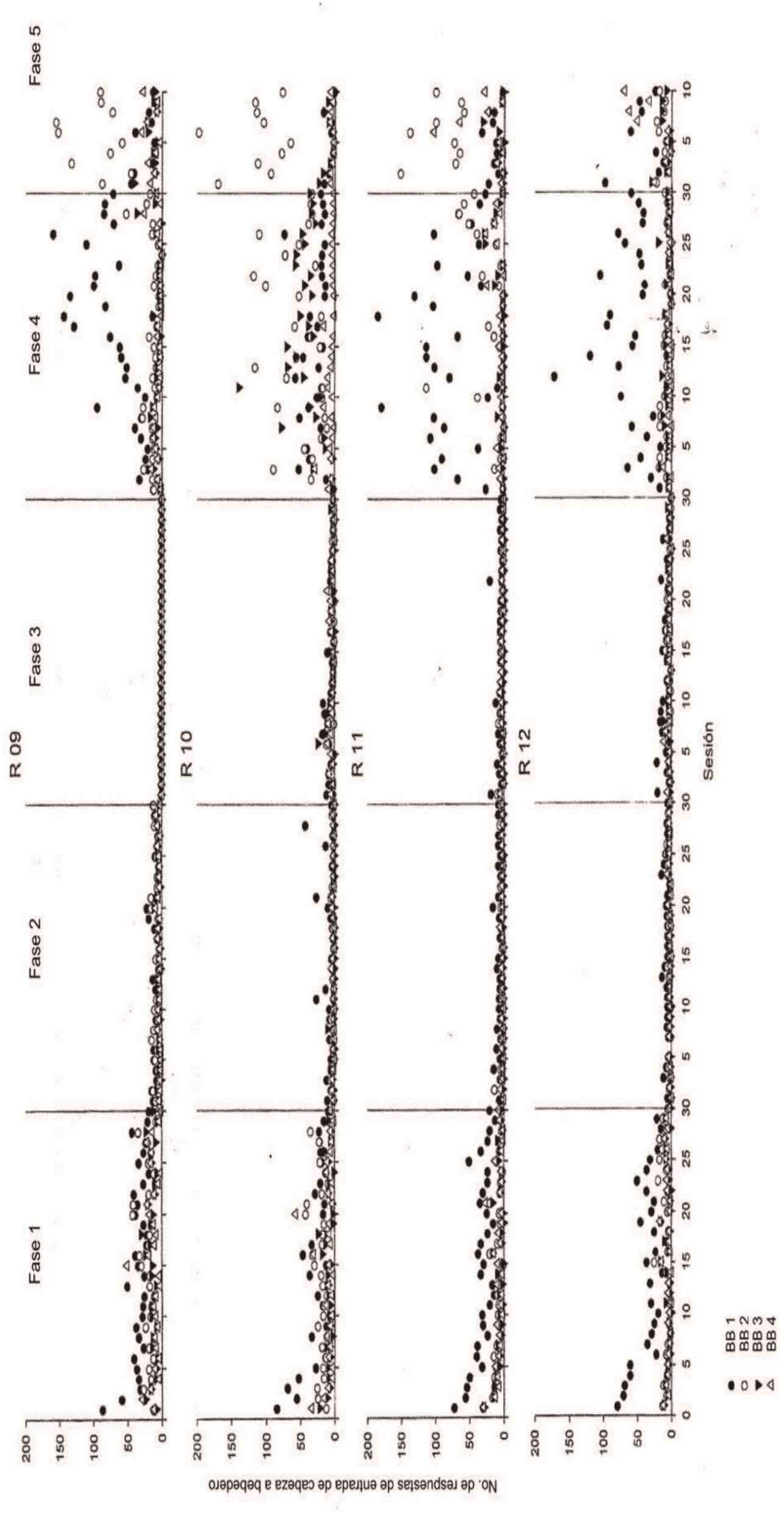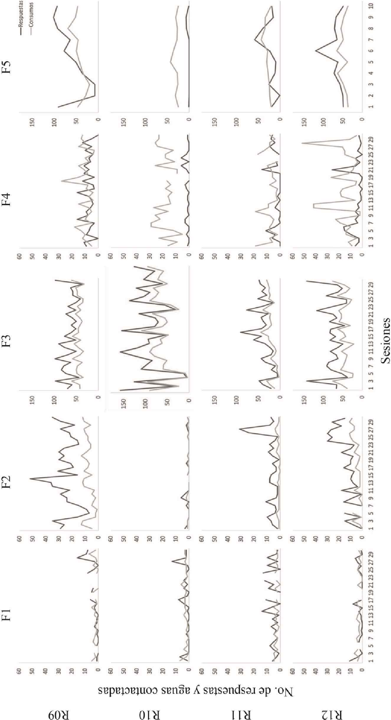 La Figura 8 muestra el número de presiones y de entregas de agua consumidas para cada rata en cada una de las sesiones y fases del experimento. En la Fase 1, con un múltiple TF, las respuestas a la palanca tendieron a incrementar en las últimas sesiones de la fase (excepto R12) a pesar de que no eran requeridas para que se entregara el agua, siendo mayor en número que el de entregas de agua consumidas. Sin embargo, fue en esta fase en la que se dieron un menor número de respuestas y de entregas de aguas consumidas en comparación con las demás fases (excepto en el caso de la R10 en la Fase 2). En la Fase 2 el número de respuestas y de consumos incrementó respecto a la Fase 1 aumentando hacia el final de la fase para la R11 y R12. Destaca que en todas las sesiones el número de respuestas fue siempre superior al número de aguas lo que indica que más de las dos terceras partes de las presiones de palanca tuvieron lugar cuando el agua no estaba disponible. En la Fase 3, con un concurrente IF, aumentaron notablemente las presiones de palanca y las entregas de agua consumidas. De manera menos marcada que en la Fase 2, la diferencia entre las respuestas y consumos indica que alrededor de un tercio de las respuestas tuvieron lugar cuando el agua no estaba disponible. El mayor número de respuestas se presentó en las ratas R10 y R12, siendo la primera la que más entregas de agua consumió de los 4 sujetos. Los tres sujetos restantes mostraron una tendencia semejante en cuanto al número de entregas de agua consumidas. Destaca el caso de la R10 que mostró la frecuencia de respuestas y consumos más elevada, a pesar de no haber respondido prácticamente durante la Fase 2 bajo el programa múltiple. En la Fase 4, con un concurrente de TF disminuyeron notoriamente la frecuencia de presiones de palanca y las aguas consumidas (excepción de R12 que presentó unos picos de consumo en sesiones intermedias y finales). Se consumieron menos entregas de agua que en la Fase 3, pero con una menor emisión de respuestas dado que no se requería presionar la palanca para que se procurara el agua. En la Fase 5, con un programa concurrente de dos componentes de TF y dos de IF, nuevamente incrementó el número de respuestas y entregas de agua consumidas semejante a la observada durante la Fase 3. R09 y R12 mostraron mayor frecuencia de presiones de palanca, especialmente en las sesiones finales (R09) e intermedias (R12). R10 y R11 mostraron frecuencias bajas y de cero respuestas (de manera más marcada para R10) pero llegaron a consumir alrededor de 20 o 25 entregas de agua en alguna de las sesiones. La frecuencia más alta de respuesta en una sesión nunca fue mayor de 150 sumando las cuatro palancas, es decir, un máximo de 5 respuestas por minuto en total, y una respuesta y “fracción” por minuto en cada palanca.