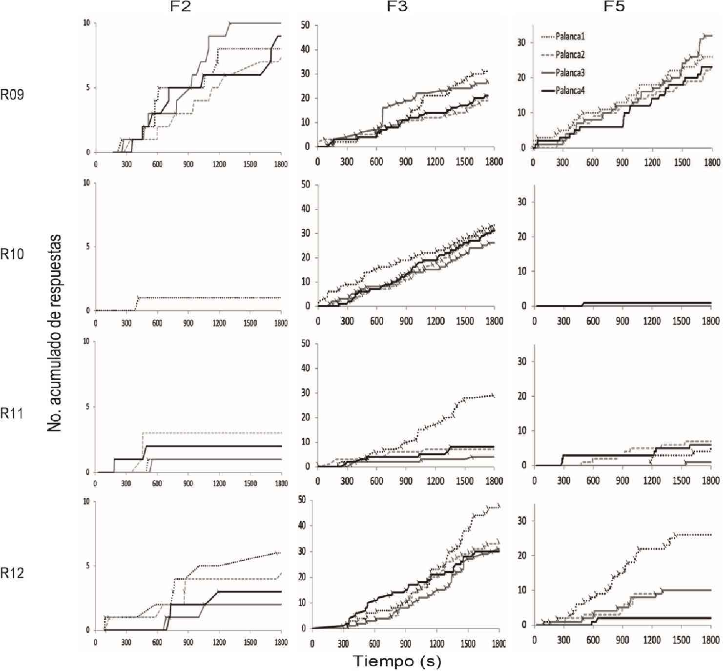 La Figura 9 muestra el registro acumulado de respuestas en la última sesión de las fases con componentes contingentes de IF (en el caso de la Fase 5 con el fin de no saturar la gráfica, se han omitido las marcas de entrega de agua en las palancas no contingentes -palancas 2 y 4-). En general se observaron principalmente patrones de pausa-carrera característicos de los programas de razón fija más que de intervalo fijo, aunque en este caso no se observó ninguna simetría entre la longitud de la carrera y la de las pausas. En ocasiones, el registro acumulativo semeja una condición de extinción con muy pocas respuestas, si acaso una o dos entre pausas largas consecutivas. Las carreras normalmente fueron cortas, interrumpidas por una o varias pausas, antes de que se procurara el agua. En algunos casos, principalmente en la Fase 2, las pausas ocurrieron después de la entrega de agua. En la Fase 3, por el contrario, los patrones de carrera se observaron después de las entregas en algunos casos. En la Fase 5 de manera similar a la Fase 1, las pausas se presentaron después de las entregas con algunos patrones de carrera posteriores a éstas en el caso de la R12. El mayor número acumulado de respuestas se presentó en la Fase 3, seguido de la 5 y finalmente la Fase 2. En la Fase 5 pareció darse una relación de la frecuencia de respuesta entre los componentes contingentes y los no contingentes principalmente en la R09 y en la R12, lo cual concuerda con la literatura citada (Edwards, Peek & Wolfe, 1970; Lachter, Cole & Schoenfeld, 1971; Lattal & Bryan, 1976; Rachlin & Baum, 1972; Zeiler, 1968;1976).