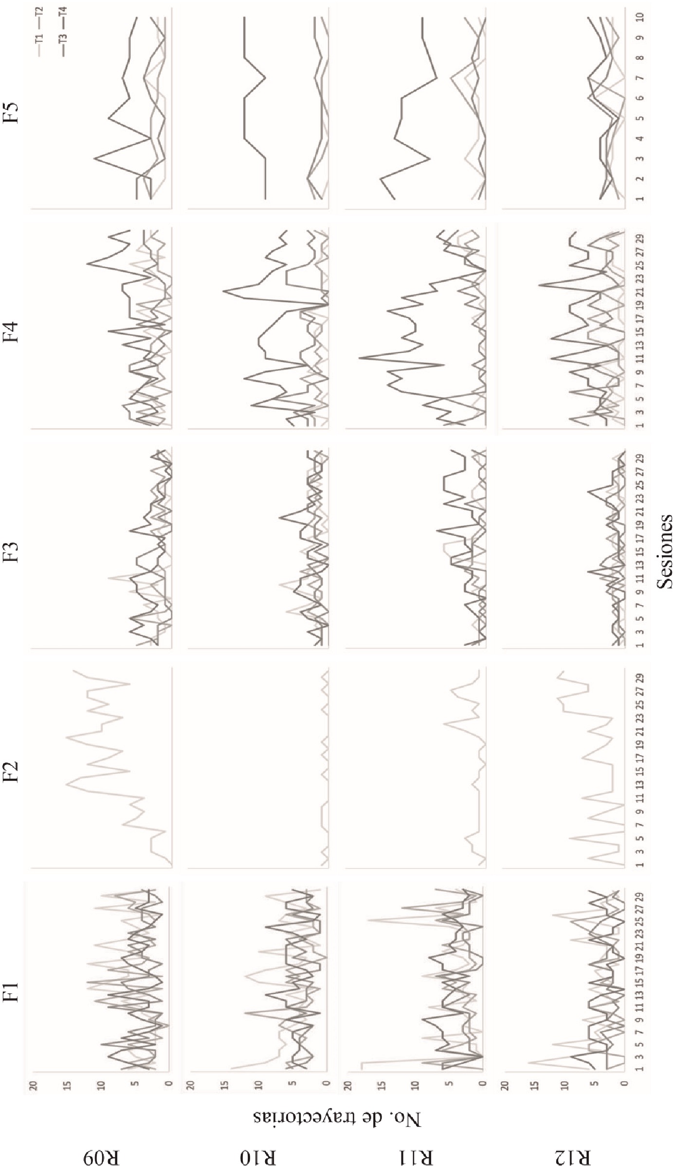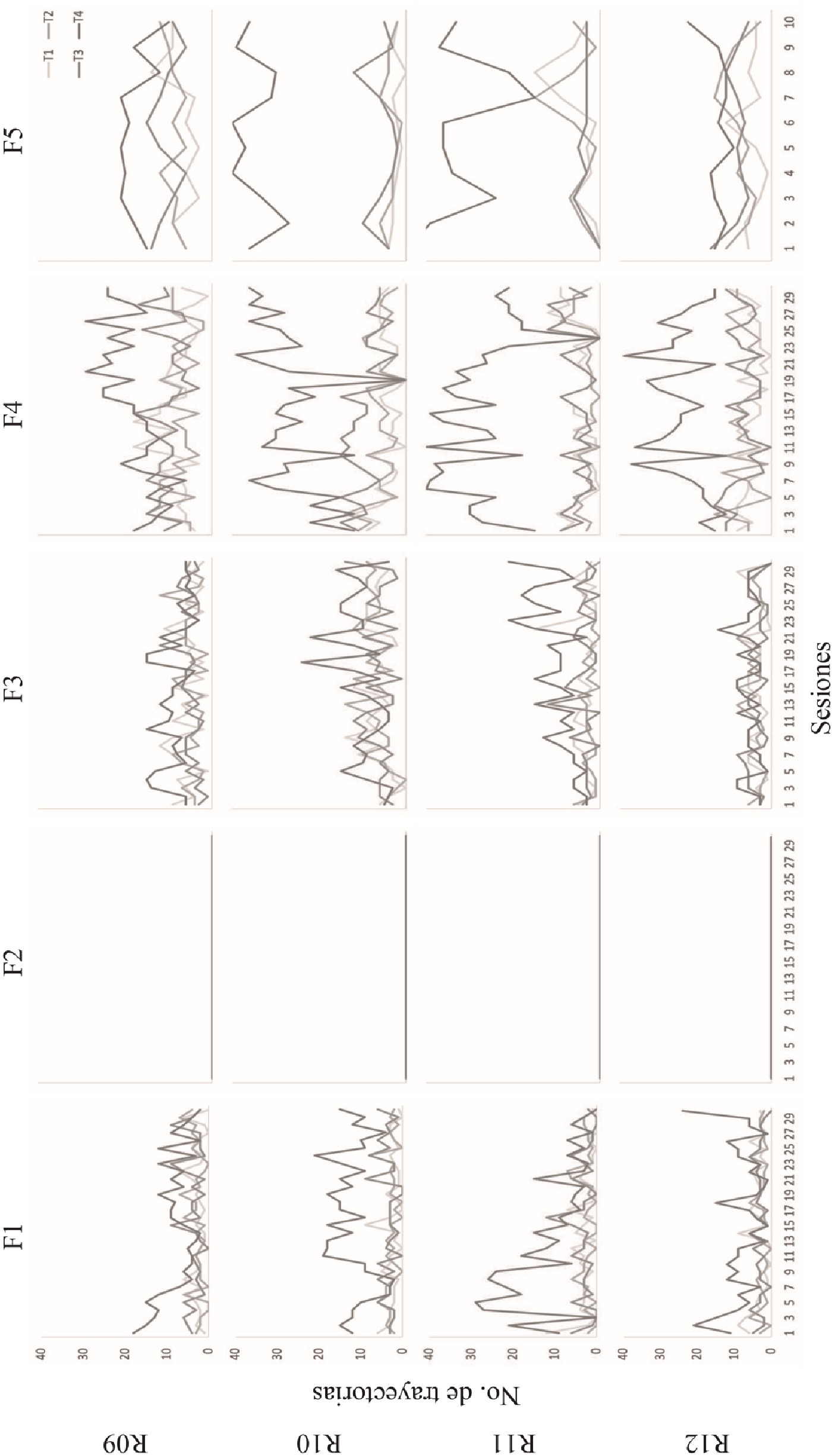 Como indicador de direccionalidad, las figuras 2 y 3 muestran las trayectorias completas funcionales (Figura 2) y no funcionales (Figura 3) de cada una de las ratas en cada una de las fases experimentales. Estas trayectorias eran funcionales si correspondían a la secuencia programada de entregas de agua, y eran no funcionales cuando no correspondían a dicha secuencia. En el caso de la Fase 2, con un programa múltiple IF, solo podían ocurrir por definición trayectorias funcionales completas del Tipo I, pues la entrega de agua en un bebedero era contingente a la entrega de agua en el bebedero previo inmediato, y de no ocurrir esta entrega, ninguna trayectoria era funcional. Los resultados muestran que en la Fase 2, solo R09 y marginalmente R12, mostraron un reducido número de trayectorias funcionales Tipo 1 (menos de 20 por sesión), mientras que R10 y R11 prácticamente no completaron trayectorias de este tipo (5 como máximo y en muy pocas sesiones), lo que significa que obtuvieron muy pocas entregas de agua. Las rutas analógicas, que se presentan en el Apéndice 1, muestran desplazamientos por el interior de la caja y en ocasiones en las paredes laterales. En lo que respecta a las otras fases, en la Fase 1 se dio el mayor número de trayectorias funcionales Tipo I, mientras que en las Fases 4 y 5 tuvieron lugar un mayor número de trayectorias funcionales Tipo IV (mantenerse en el mismo bebedero). En la Fase 3 hubo pocas trayectorias funcionales completas y se distribuyeron entre los distintos tipos. Las trayectorias no funcionales consistieron en su mayor parte del tipo IV en todas las fases (excepto en la 2, en que no hubo trayectorias completas). Es importante señalar que el cumplimiento de trayectorias funcionales no significa que se haya consumido el agua (probablemente por la disponibilidad limitada de tres segundos). En la Fase 1, con entrega no contingente en secuencia se dieron menos aguas contactadas que en las fases 3, 4 y 5, con programas concurrentes de IF que entregaban el agua, dado el caso, después de la respuesta oportuna.