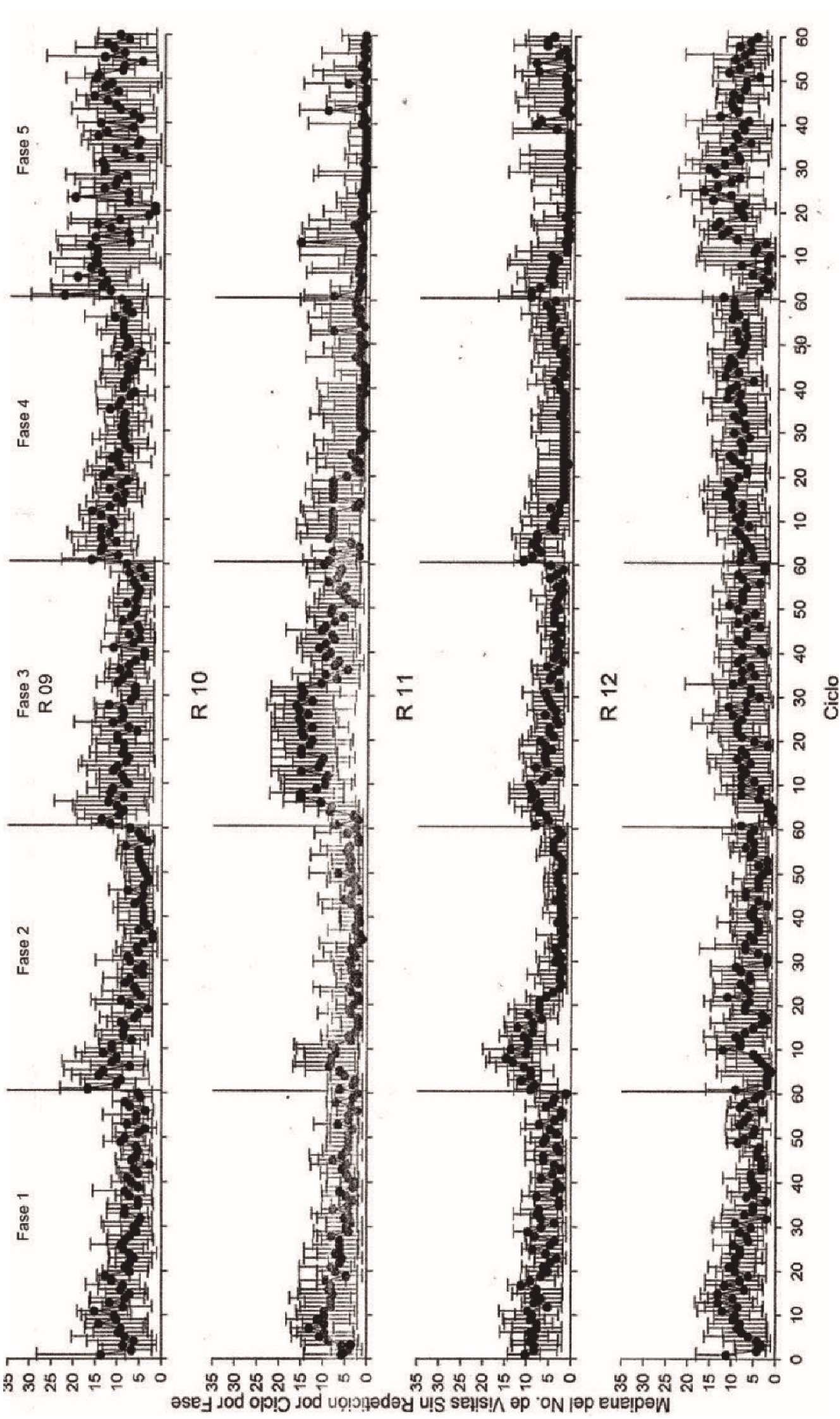 La Figura 4 describe las visitas no repetidas a cada una de las 64 celdas del espacio experimental como medida de variación del comportamiento. A mayor número de visitas no repetidas mayor variación en el patrón de desplazamiento. Para el análisis y la representación de las visitas no repetidas, cada sesión se dividió en 60 ciclos fijos de 30 segundos. Se prefiere el análisis por ciclo debido a que esta segmentación fue más sensible a la identificación de cambios que no fueron apreciables en un análisis por sesión. En general, la variación no fue muy elevada, sin pasar de 15 o 20 celdas visitadas no repetidas, con rangos de 0 a un máximo de 30, observándose la mayor variación en las fases con programas concurrentes, pero de manera asistemática. Estos datos sugieren que las ratas se desplazaban recurrentemente por las mismas zonas, concentrándose en áreas relativamente restringidas.