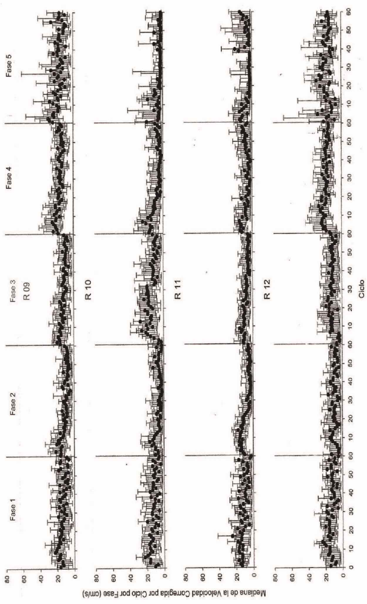 La Figura 6 muestra la velocidad corregida en los desplazamientos de las ratas como indicador del vigor de la conducta. La velocidad corregida es la distancia (cms) recorrida sobre tiempo sin interrupciones, es decir, sin estancias intermedias. Al igual que en el caso de las visitas no repetidas como medida de la variación, en el caso de la velocidad el análisis se presenta por ciclos fijos de 30 segundos con el fin de apreciar cambios locales de velocidad no identificables en un análisis por sesión. Las ratas mostraron una velocidad uniforme a lo largo de las distintas fases, con una mediana nunca mayor de 30 centímetros por segundo, aunque se observaron algunos picos de 40 a 80 en la Fase 5 principalmente, y menos en la Fase 4 en R09 y R12. La baja velocidad registrada puede indicar la ocurrencia de estancias entre carreras y que la velocidad de reinicio en trayectos cortos pudo ser baja.