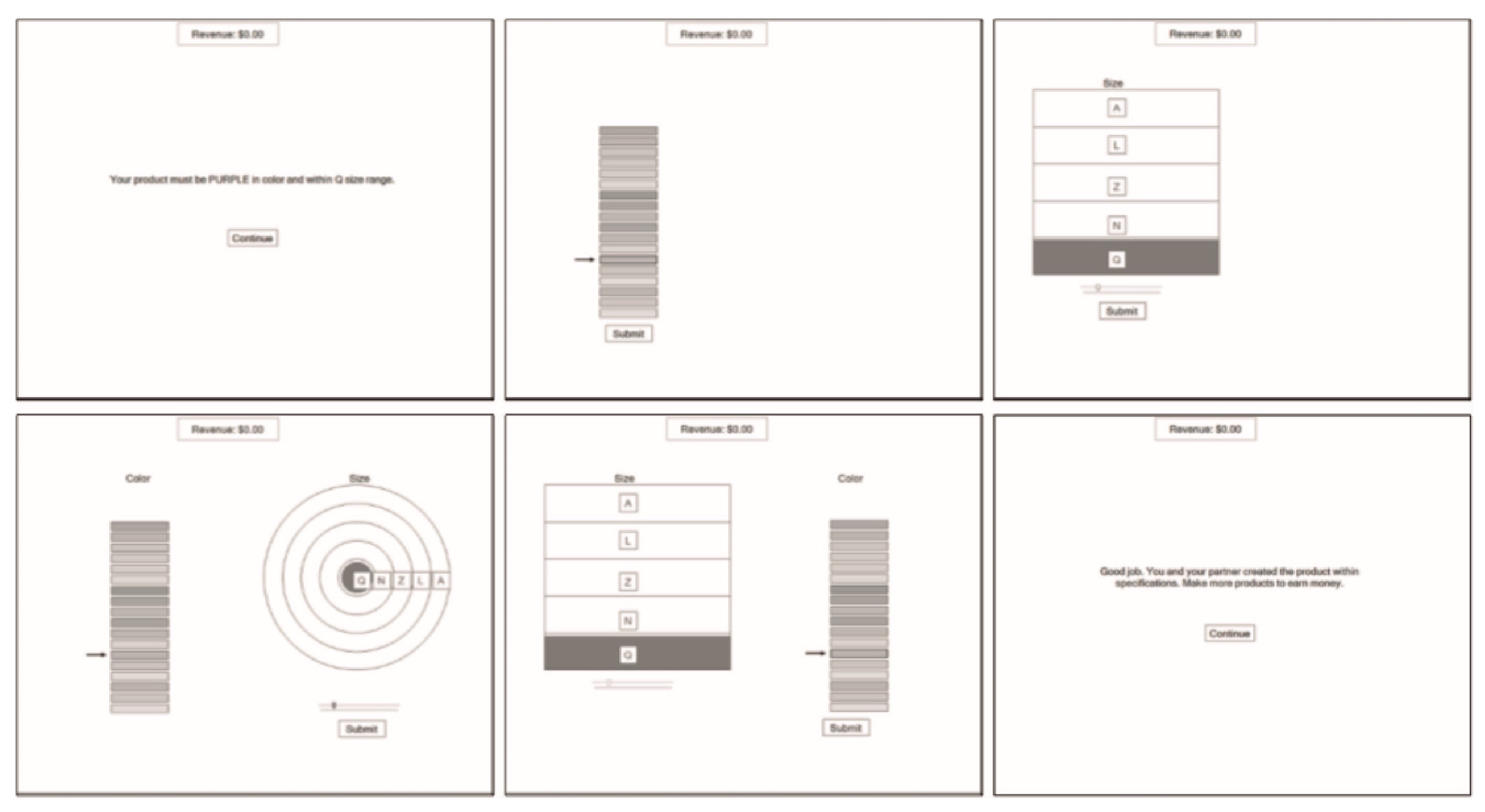 All colors and sizes of rules were presented in a randomized order phase to phase such that no one color, or size, could be part in consecutive rules. Selection of rules for each condition was the same across groups such that all dyads were exposed to the same rules in same order, according to the experimental group. Rule criteria (color and size) were the same for both participants in each phase. Participants could choose from 18 color options, three variations (hues) per color. Participants selected the color for their product by clicking over one of the options and clicking submit. Different from selecting color, the size was selected by moving a scroll bar such that a portion (i.e., size) of the part was filled varying along a continuum. The only difference between phases were the rules presented at the beginning of each trial and a change in consumer demand (correct size and color). Phase changes were therefore signaled by the presentation of a new form of rule. After completing a questionnaire, participants were shown a screen telling them to inform the research assistant that the task had ended.