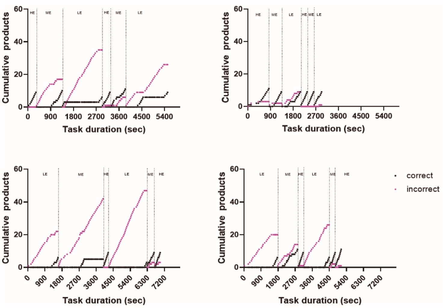 Note. Cumulative correct and incorrect products across conditions by exemplar dyads in the NV HE-LE (top left), V HE-LE (top right), V LE-HE (bottom right), and NV LE-HE (bottom left) groups.
