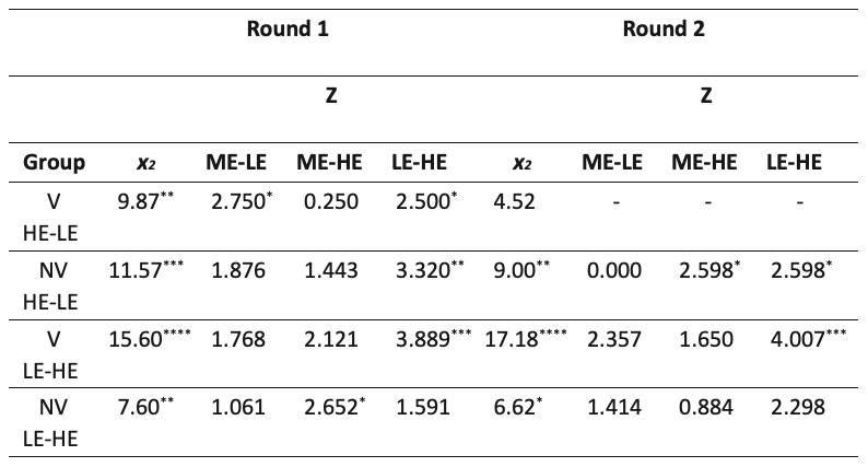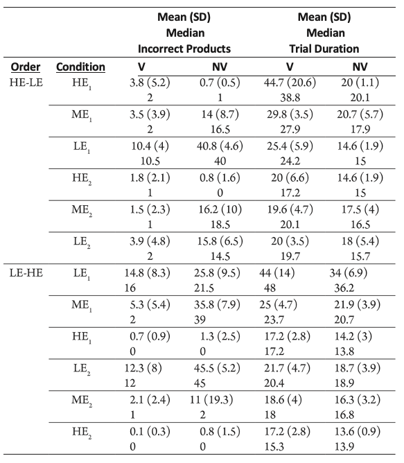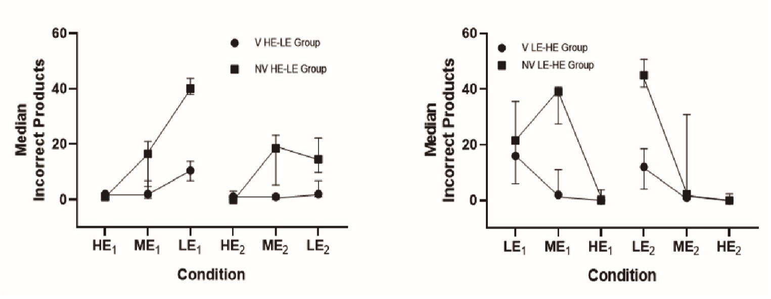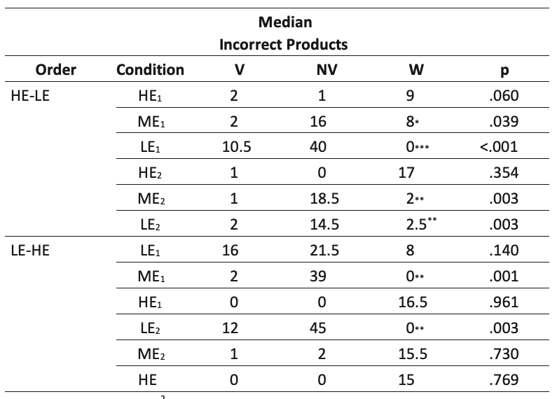 Friedman tests were performed to assesses differences in median incorrect products produced across conditions for each round (i.e., set of HE, ME, and LE conditions) for each group, as shown in Table 6. Significant differences were found in incorrect products across conditions in each round for all groups (. < .01) with the exception of round 2 for the V HE-LE group (.= .12). Post-hoc Dunn’s multiple comparisons tests with Bonferroni correction found significant differences between median incorrect products produced in ME. and LE. for the V HE-LE group (. < .05), LE. and HE., ME. and HE., and LE. and HE. for the NV HE-LE group (. < .05), LE. and HE. as well as LE. and HE. for the V LE-HE group (.< .001), and ME. and HE. for the NV LE-HE group. No other pairwise differences were found to be significant.