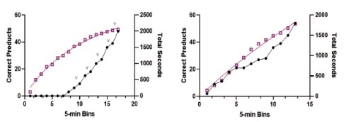 For some dyads, though, increasing patterns of cooperation for a longer period of time were observed. These dyads also seem to have had a more irregular generation of correct products. Although time spent communicating diminished over time, individuals did not stop cooperating altogether until the end of the experimental session. Other secondary verbal adjustments were also observed in these dyads. Some of these secondary adjustments occurred sporadically (e.g., teaching), while others occurred with more regularity (e.g., persuading), but significantly less than cooperative patterns.