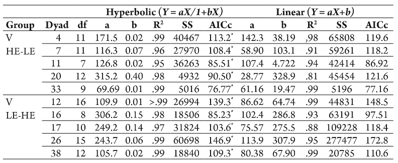 Table 7 shows both nonlinear and linear regression results for cumulative seconds of cooperative verbal activity across 5-minute intervals for dyads in both V groups, where a and b were fitted parameters. These curves were fitted for the whole task, regardless of condition. We fitted each model to each dyad’s cumulative seconds of cooperative secondary adjustments. Akaike’s corrected information criterion (AICc; Burnham & Anderson 2002) was then used to assess the relative goodness of fit of each model. Across all dyads, cumulative seconds of cooperative adjustments was better represented by a hyperbolic function (Y = aX/1+bX) than a linear function (Y = aX+b) in terms of both R. and AICc, although sometimes only slightly.