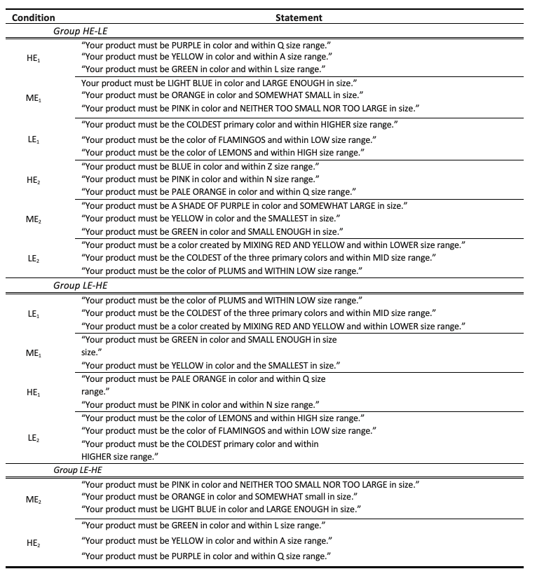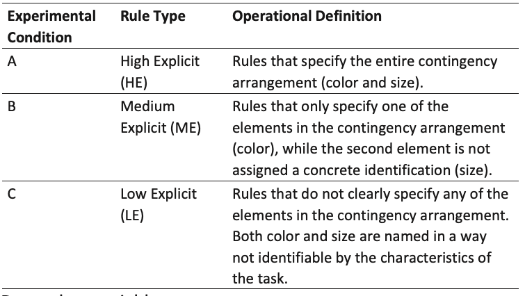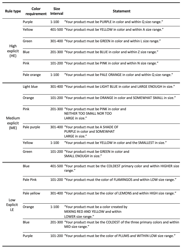 The independent variables included the following rules that were presented to the participants at the beginning of each trial: (A) high explicit–HE; (B) medium explicit–ME; (C) low explicit–LE. The rules specified how participants should respond in order to correctly complete APs on which they worked (see Appendix B). High explicit (HE) rules specified precisely how participants should respond in terms of size and color of forms (e.g., “Your product must be PURPLE in color and within Q size range”); medium explicit (ME) rules only specified color whereas size was vague (e.g., “Your product must be ORANGE in color and SOMEWHAT SMALL in size”); and in low explicit (LE) rules specifications of both color and size of forms were ambiguous, and fairly open to interpretation by participants (e.g., “Your product must be the color of FLAMINGOS and within LOW size range”). Following Peláez and Moreno’s (1998) rule taxonomy, rules varied in degrees of explicitness such that the more implicit the more elements were implied (the discriminative stimuli, context, or consequence). The rules in all conditions described consequences in a similar way but differed with respect to the clarity of which they describe stimuli relevant to the orientation required for a particular response. HE rules contained explicit/explicit components (explicit color and size), ME rules contained explicit/implicit components (explicit color and implicit size), and LE rules comprised implicit/implicit components (implicit color and size). See Table 1 for a complete definition of each rule type.