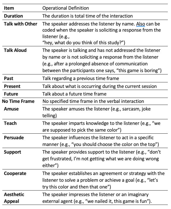 The dependent variables included frequency of correct responses and APs across experimental conditions and time to complete three consecutive APs for the same rule. The dependent variables associated with verbal interactions included the frequency and types of secondary verbal adjustments such as persuasive statements and humor during five-minute intervals (seeTable 2) across experimental conditions. The method to analyze verbal interactions was based on Bijou et al.’s (1988) coding system of referential interactions (seeSmith et al., 2011; Smith et al., 2012; Johnson et al., 2010).