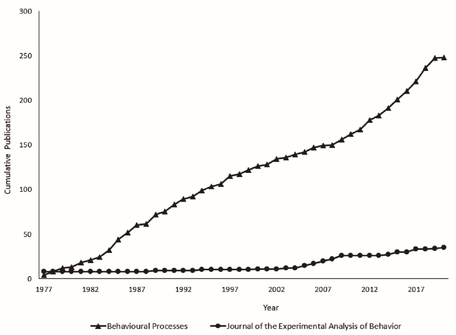 To examine the frequency of mouse related articles in behaviorally oriented journals, a literature review was conducted. Two journals were selected for this review, one primary behavior analytic journal (JEAB) and one journal which focuses on animal behavior and learning from multiple perspectives (Behavioural Processes). Using the database ULRICHSWEB dates of first publication were established for each journal; 1958 (JEAB) and 1977 (Behavioural Processes). To compare publication trends across journals, dates for the current review were limited to 1977-2020. PsycINFO was used to conduct a search for each journal using the following convention: Journal Title (SO Publication Name) AND Mice with the year parameters of 1977-2020. Figure 1.0 depicts a cumulative record of mouse related publications in each journal over the allotted time. As depicted in the graph, Behavioural Processes began to publish mouse related articles much earlier and boasts a more sustained growth in this area over time as compared to JEAB. To rule out publication volume as a factor that might skew these data, the proportion of mouse related articles in each journal was calculated by dividing the number of mouse related articles by the total number of articles. Over this period, the proportion of articles published in Behavioural Processes related to mice was 6% compared to only 1% in JEAB. These results indicate that the disparate data paths cannot be explained by differences in publication volume alone. Careful analysis of mouse related publications in JEAB indicate growth since the early 2000s with the cumulative number of publications more than doubling from 15 in 2005 to 35 at the time of this publication. While this represents substantial growth when compared to the early and sustained growth noted in Behavioural Processes, it appears that behavior analysts may be “missing the boat” when it comes to this important trend in animal research.