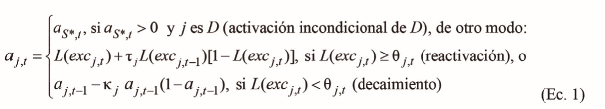 donde . = excj,t, μ = 0.5 y σ = 0.1. Los parámetros libres se mantuvieron constantes en todas las simulaciones y permiten un valor de la función mayor que cero (aproximadamente 0.006) cuando excj,t = 0.0, lo cual simula una activación espontánea cercana a cero.
