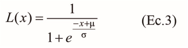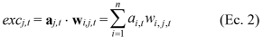 donde aj,t denota el vector de activaciones de los aferentes que recibe j (j permanece constante en esta ecuación, ya que denota la unidad particular cuyos pesos se van a actualizar) en t, wi,j,t denota el vector de pesos de las conexiones de todas las unidades conectadas a . (1 ≤ . ≤ .), y . es el número total de unidades conectadas a .. excj,t es el argumento de la función logística L, definida como: