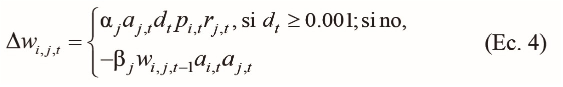 Esta regla se utiliza para cambiar el peso (.) de una conexión de una unidad presináptica . a una unidad postsináptica . en cada momento .. Un peso se puede entender como la efi cacia con la cual una unidad activa a otra. En este modelo, todos los pesos, así como las activaciones, son números entre 0.0 y 1.0. Por lo tanto, no hay pesos negativos, a diferencia de otros modelos. La regla de aprendizaje se defi ne en terminos del cambio de (∆) de los pesos y tiene la siguiente forma: