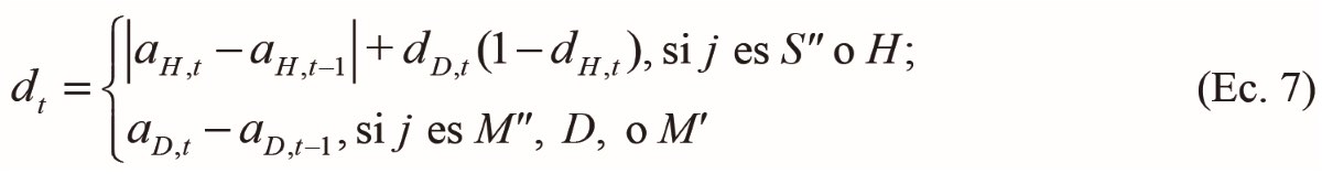 El factor central de la regla es dt, una señal difusa que modula los cambios en todos los pesos en cada momento t. Es una diferencia temporal entre activaciones de las unidades H y D en momentos sucesivos t y t – 1, y se calcula de la siguiente forma: