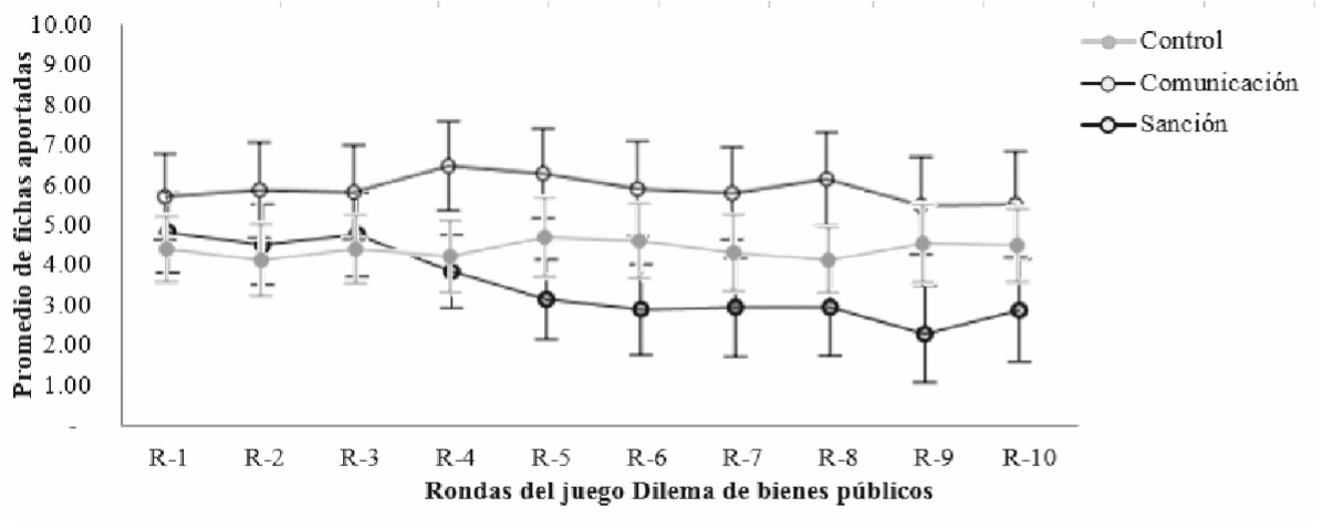 Se realizó un análisis factorial de varianza de medidas repetidas para identificar variaciones en el patrón de aportación de los participantes a lo largo de las rondas, de manera independiente para cada condición experimental (sanción, comunicación y control). Los resultados del análisis mostraron nulas diferencias significativas en las tres condiciones experimentales, lo que sugiere que la elección de los participantes se mantenía relativamente estable entre las rondas, aunque se aprecia un ligero incremento de fichas aportadas por el grupo de sanción a partir de la séptima ronda. No obstante, al comparar la aportación promedio de los participantes entre las condiciones experimentales se encontraron variaciones significativas, F(2,117)=4.01, p<.05, la aplicación del análisis post hoc de Bonferroni mostró que dichas diferencias solo se presentan en el grupo con comunicación respecto a los otros dos grupos (p<.05). En la Figura 1 se presenta el promedio de aportación de todos los participantes en cada ronda por condición experimental.