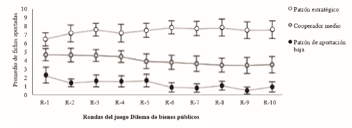 El segundo patrón de aportación fue denominado como cooperador medio debido a que en todas las rondas el promedio de aportaciones de los participantes fue similar a la cantidad media del recurso máximo que podían aportar, siendo este patrón de aportación una línea casi completamente horizontal. Este conglomerado estuvo conformado por 51 participantes, de los cuales el 22 % fueron del grupo con comunicación.