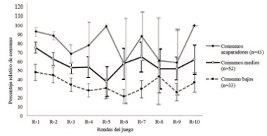 Con el fin de clasificar a los participantes con base en su consumo de fichas, independientemente de la condición experimental, se aplicó el análisis de conglomerados de K-medias, tomando como variable de agrupación promedio del valor relativo de consumo de cada participante a lo largo de las rondas, identificando tres patrones de consumo, que presentaba diferencias significativas entre sí (p<.0001): moderados, altos y acaparadores. En promedio, los participantes del conglomerado de consumos moderados (n=33) tomaron el 35.29% del recurso disponible a lo largo de las rondas. En el segundo conglomerado, consumos altos (n=52), se realizaron consumos promedios del 60%. Finalmente, se identificó un conglomerado en el que los participantes realizaron consumos relativos del 83.49%, en dicho conglomerado se identificó que 30 de los participantes solicitaban cantidades tan altas de la urna que terminaron agotando el recurso en las primeras rondas, por ello el conglomerado se denominó como acaparadores. La Figura 4 muestra gráficamente el consumo promedio que tuvieron los participantes en cada uno de los tres conglomerados.