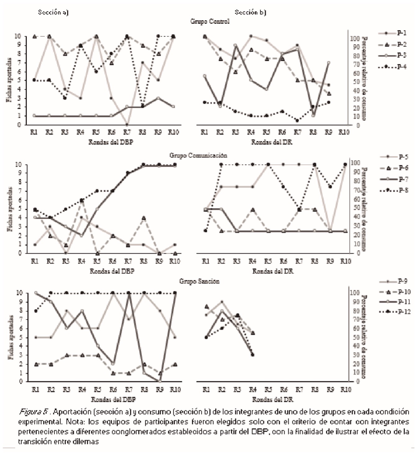 Nota. Aportación (Sección a) y consumo (Sección b) de los integrantes de uno de los grupos en cada condición experimental. Los equipos de participantes fueron elegidos solo con el criterio de contar con integrantes pertenecientes a diferentes conglomerados establecidos a partir del DBP, con la finalidad de ilustrar el efecto de la transición entre dilemas.