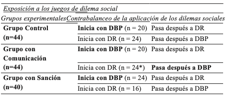 Se utilizó un diseño de grupos aleatorios (Arnau et al., 1990), estableciendo como variable independiente las condiciones bajo las cuales se realizaría el intercambio: comunicación, sanción y sin comunicación ni sanción (grupo control). En cada grupo los participantes fueron expuestos al dilema de bienes públicos y al dilema de recursos en equipos de 4 alumnos. En la condición (a) de comunicación, antes de cada ronda se proporcionó a los participantes tabletas y se les permitía enviar mensajes de texto a un grupo en común de chat de Facebook, durante dos minutos, después de los cual realizaban sus elecciones; en la condición (b) de sanción, al final de cada ronda, cada integrante del equipo era informado de las elecciones realizadas, manteniendo anonimato respecto a cuál elección era de cada uno, y podía multar las elecciones individuales de los otros participantes restándoles fichas, pudiendo restar un máximo de 5 fichas a cada compañero por ronda, con un costo de una ficha propia por cada ficha restada al compañero, y siendo irrecuperables las fichas usadas para multar; (c) grupo control, sin comunicación ni posibilidad de sanción[3] los participantes fueron simplemente expuestos a los dilemas sociales. La mitad de los equipos en cada condición experimental inició con el DR y la otra mitad inició con DBP. La aplicación de los juegos se estandarizó mediante el uso de un manual de procedimientos para la aplicación de los dilemas sociales[4], previamente validado por jueces expertos. Se realizaron cuatro pruebas piloto para cada una de las condiciones experimentales a fin de asegurar la comprensión de las instrucciones por parte de los niños y el uso de los mejores parámetros para la aplicación de los juegos, a través de las cuales se creó la versión final de instrucciones y se delimitó el número de ensayos necesarios para la comprensión de la tarea. Para la aleatorización, se conformaron primero los equipos de cuatro participantes, y posteriormente cada equipo fue asignado a uno de los grupos experimentales, luego, se designó a cuál de los dos dilemas sociales serían expuestos primero para cada equipo. Cabe mencionar que en la condición de sanción uno de los equipos fue omitido, debido a un evento escolar no previsto. La Tabla 1 resume el diseño del estudio y se especifica la . de cada grupo experimental.