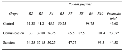 Nota: Las casillas vacías se deben a que no hubo participantes que jugaran esa cantidad específica de rondas. Análisis post hoc mostraron diferencias significativas entre las ganancias obtenidas por los participantes en la condición de comunicación con respecto a los otros *p<.0001