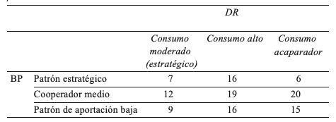 La matriz permite identificar, a partir de la diagonal, a los participantes que presentaron un patrón estratégico similar tanto en el DR como en el DBP, que implicaría aportar y consumir cantidades inversamente proporcionales (34% de los casos). No obstante, la estrategia de los participantes varía en su mayoría de un juego a otro; cerca de dos terceras partes de los participantes modificaron su estrategia al ocurrir la transición entre los dilemas, lo que denota que los patrones de elección son sensibles a la tarea.