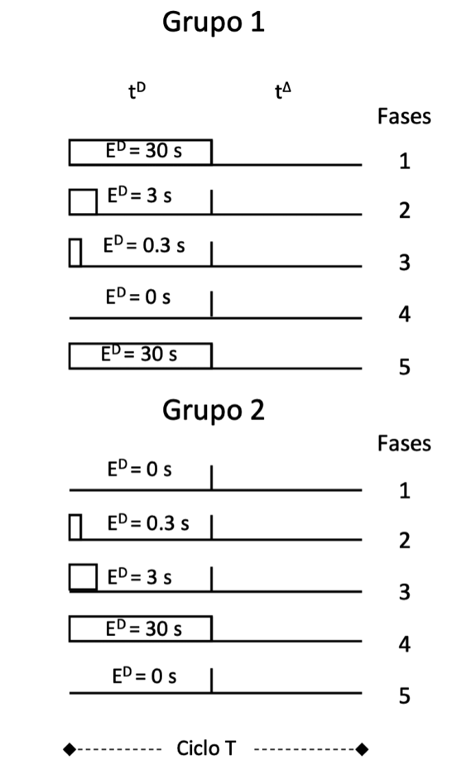 Nota. Esquema gráfico de la duración del estímulo correlacionado al subintervalo tD (ED) dentro del ciclo T en cada una de las fases experimentales para el Grupo 1 y Grupo 2.
