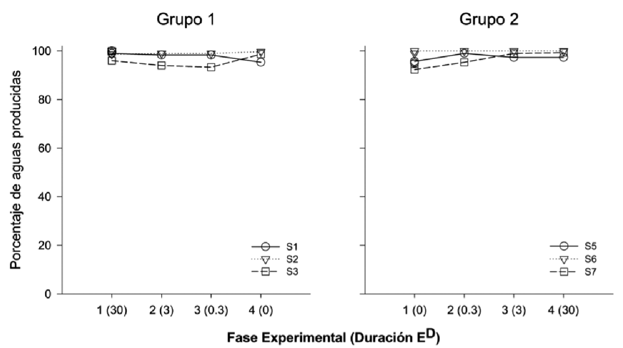 En la Figura 2 se muestra el porcentaje promedio de entregas de agua producidas en cada una de las fases experimentales y de re-determinación para cada uno de los sujetos de ambos grupos en las últimas cinco sesiones de cada condición. Las ejecuciones de los sujetos de ambos grupos mostraron que no hubo un efecto de la manipulación de la duración del estímulo correlacionado a t. en la medida en que se observó un porcentaje alto de entregas de agua producidas, el cual se mantuvo en un rango entre 90% y 100%.