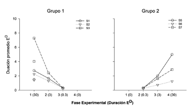 La Figura 3 muestra la duración promedio del estímulo correlacionado al subciclo t. para cada sujeto en cada uno de los grupos experimentales en las últimas cinco sesiones. Para las ratas del Grupo 1 se observó una función de disminución en la duración del estímulo a lo largo del experimento. Las ratas S1 y S2 mostraron duraciones promedio entre los 2 y 3 s en la Fase 1 (30 s). La rata S3 generó una duración promedio de 7 s en esta condición. Durante la Fase 2, las tres ratas generaron duraciones por debajo de los 3 s. Por último, en la Fase 3 (0.3 s), se obtuvieron duraciones coincidentes con el valor predeterminado. En la condición de re-determinación las duraciones del estímulo correlacionado estuvieron por debajo de las obtenidas en la Fase 1 (S1 y S2 > 2 s; S3 = 4 s). Las ratas del Grupo 2 mostraron un aumento en la duración del estímulo a lo largo del experimento. Durante la Fase 1 (0.3 s), se obtuvieron duraciones coincidentes con el valor predeterminado.