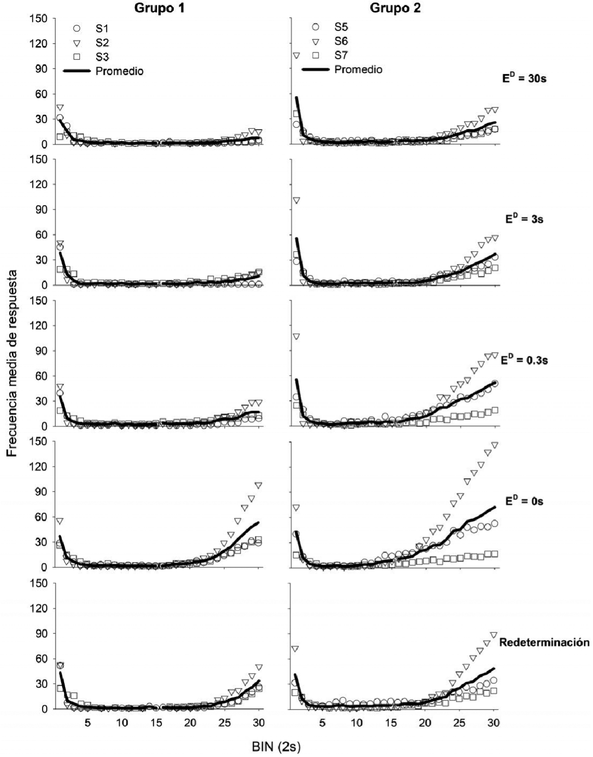 Durante la Fase 4 (E.= 0s), el patrón de respuesta mostró un cambio cualitativo importante. La distribución de la respuesta dentro de los bines pertenecientes al subintervalo t. se incrementó de forma notable, llegando a observarse una frecuencia promedio por bin cercana a las 60 respuestas. Este efecto se mantuvo durante la Fase 5, de re-determinación (E.= 30s). Los resultados obtenidos en este grupo contrastan, por lo menos parcialmente, con los hallazgos reportados empleando programas temporales (Ribes-Iñesta y Carpio, 1991; Ribes-Iñesta y Torres, 1996), en los que se suele reportar una mayor frecuencia de respuesta asociada al subintervalo t.. En términos generales, durante las primeras tres fases, la respuesta se concentró en los momentos iniciales del ciclo T, manteniendo una frecuencia cercana a 0 en el resto del ciclo. Este resultado sugiere precisión y eficiencia del responder ante condiciones de señalización de la disponibilidad para la entrega de agua contingente (Reed, et al., 1992; Schrader y Rachlin, 1976).