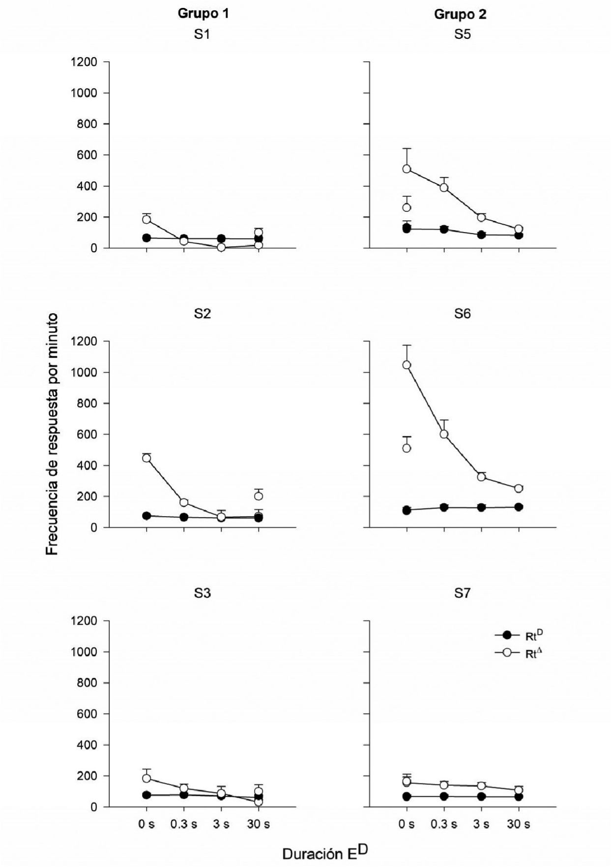 La Figura 5 muestra la frecuencia promedio de respuesta por minuto obtenida en los subciclo t. y t. para cada rata en ambos grupos, en cada una de las fases experimentales. En términos generales se observaron dos efectos consistentes en ambos grupos. En primer lugar, ninguna de las ratas mostró cambios en la tasa de respuesta a lo largo de las condiciones experimentales durante el periodo t.. En segundo lugar, los efectos de la manipulación de la duración del estímulo correlacionado se observaron primordialmente bajo el periodo de t.. En el Grupo 1, la tasa se mantuvo por debajo de las 100 respuestas por minuto. Las ratas del Grupo 2 mostraron ejecuciones un poco más altas que las obtenidas en el Grupo 1, esto es, por arriba de las 100 respuestas por minuto. Durante el período t. se observaron cambios sistemáticos en términos de los valores de la señal correlacionada al subintervalo t. en ambos grupos. El Grupo 1 mostró una función creciente en la tasa de respuesta que correlacionó con el decremento en la duración de la señal correlacionada a t.. Además, todas las ratas de este grupo mostraron una tasa más elevada de respuesta en la condición de redeterminación respecto de la Fase 1 (30 s). El Grupo 2 mostró un decremento en la tasa de respuesta en el subintervalo t. conforme aumentó la duración del estímulo correlacionado a t.. Con excepción de la rata S7, se observó una tasa de respuesta más baja en este subintervalo en la fase de re-determinación en el resto de las ratas.