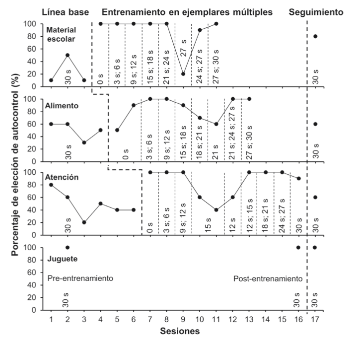 El establecimiento de la elección de autocontrol se realizó simultáneo al entrenamiento en ejemplares múltiples. Los ejemplares fueron diferentes entre escenarios incluyendo los estímulos discriminativos, reforzadores, instructores y condiciones de entrenamiento. En general, se observó un aumento en la elección de autocontrol en cada escenario. Por ejemplo, en el escenario juguete, el desvanecimiento de la demora y señalar la demora resultó en el incremento de la elección de autocontrol replicando hallazgos previos (e.g., Vessells et al., 2018; Vollmer et al., 1999). Si bien en algunas sesiones se decrementó el valor de la demora, la elección de autocontrol nunca disminuyó en niveles similares a los de Línea base y se logró establecer la elección de autocontrol con la demora meta. El procedimiento de desvanecimiento de la demora combinado con auto-instrucciones también resultó en mayor elección de autocontrol con ambos participantes, replicando hallazgos previos (e.g., Binder et al., 2000; Gomez Becerra y Luciano Soriano, 1991). Aunque se decrementaron algunas demoras, se logró establecer la elección de autocontrol con la demora meta.