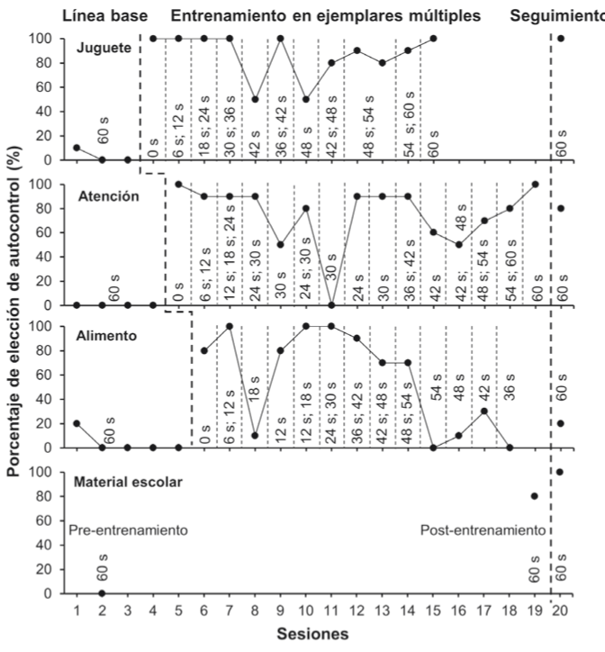 a) elección de autocontrol menor a 60% en las últimas tres sesiones de la Línea base; b) incrementó la elección de autocontrol en más del 70% (excepto en dos sesiones) hasta alcanzar la duración de la demora meta con el desvanecimiento de la demora y RDA en el Entrenamiento; y c) la elección de autocontrol se mantuvo en el 60% en el Seguimiento. En el escenario atención (tercer panel de la Figura 1) los resultados fueron: a) elección de autocontrol menor al 50% en las últimas tres sesiones de la Línea base; b) incrementó la elección de autocontrol al 100% hasta la demora 12 segundos con el desvanecimiento de la demora y las auto-instrucciones durante la demora en el Entrenamiento. Después de disminuir la demora, se observó un incremento de la elección de autocontrol de más del 90% hasta alcanzar la demora meta; y c) la elección de autocontrol se mantuvo en un 60% en el Seguimiento. En el escenario juguete (panel inferior de la Figura 1) no se realizó entrenamiento directo y los resultados del sondeo fueron los siguientes: a) elección de autocontrol de 100% en el pre-entrenamiento; b) elección de autocontrol de 100% cuando se le presentó un temporizador durante la demora en el post-entrenamiento; y c) la elección de autocontrol se mantuvo al 100% en el Seguimiento.