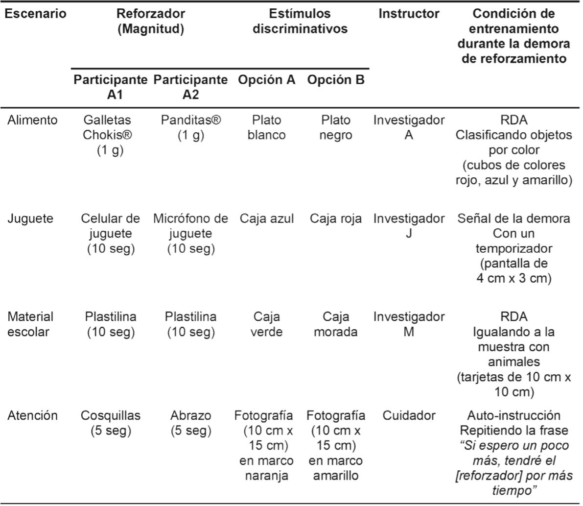 Las sesiones se condujeron en cuatro escenarios con ejemplares múltiples, los cuales difirieron por el reforzador, estímulo discriminativo, instructor y la condición de entrenamiento durante la demora del reforzador de mayor magnitud. En la Tabla 1 se describen los estímulos y condición de entrenamiento de cada escenario por cada participante. Respecto a los cuidadores, se les explicaban las instrucciones y actividades que realizaron previo a cada sesión, pero no se les mencionó los resultados o criterios de cambio previstos para cada sesión (esto para evitar sesgo por expectativa).